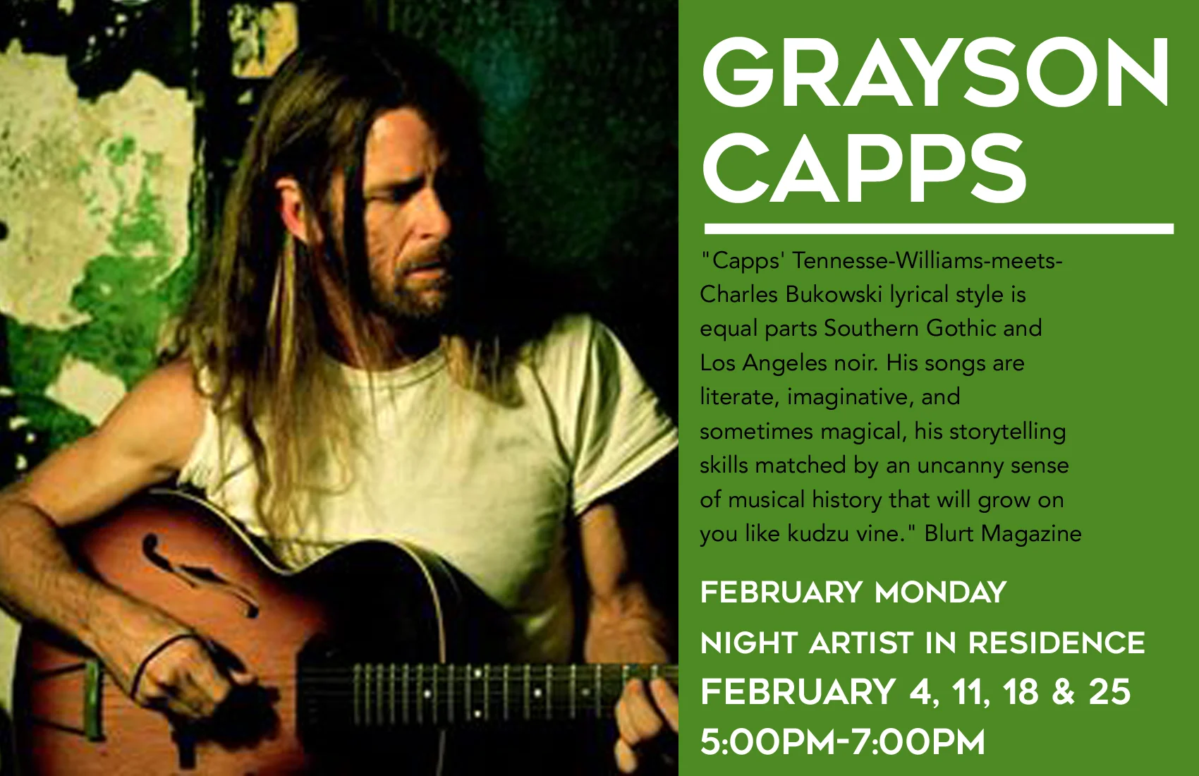 "Capps' Tennesse-Williams-meets-Charles Bukowski lyrical style is equal parts Southern Gothic and Los Angeles noir. His songs are literate, imaginative, and sometimes magical, his storytelling skills matched by an uncanny sense of musical history that will grow on you like kudzu vine." Blurt Magazine