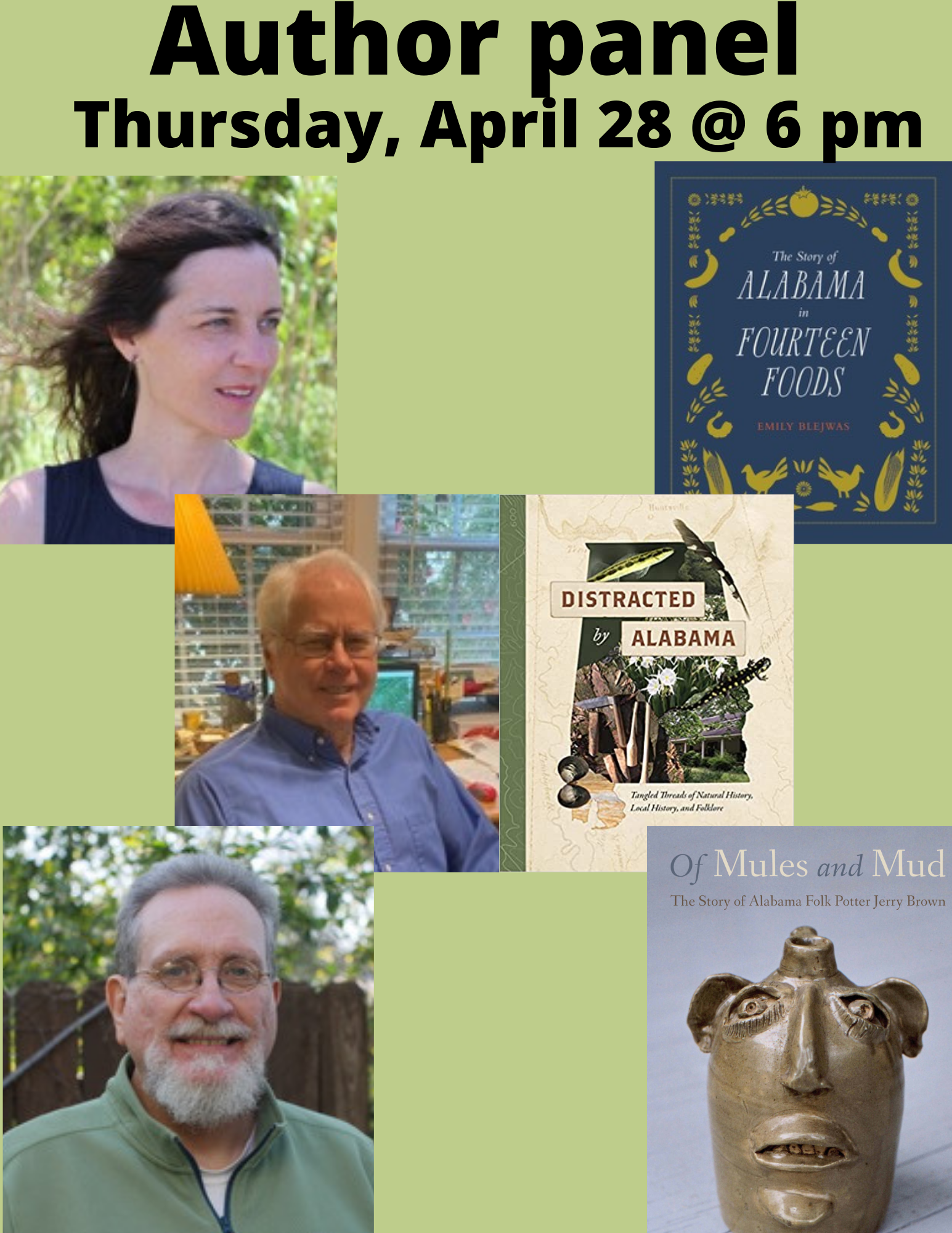 On Thursday, April 28th Emily Beejwas (Author of The Story of Alabama and Fourteen Foods), James Seay Brown Jr. (Author of Distracted by Alabama) and Joey Brachner (Author of Of Mules and Mud) will form a panel Discussion in the Book Cellar to discuss Alabama Folkways!!