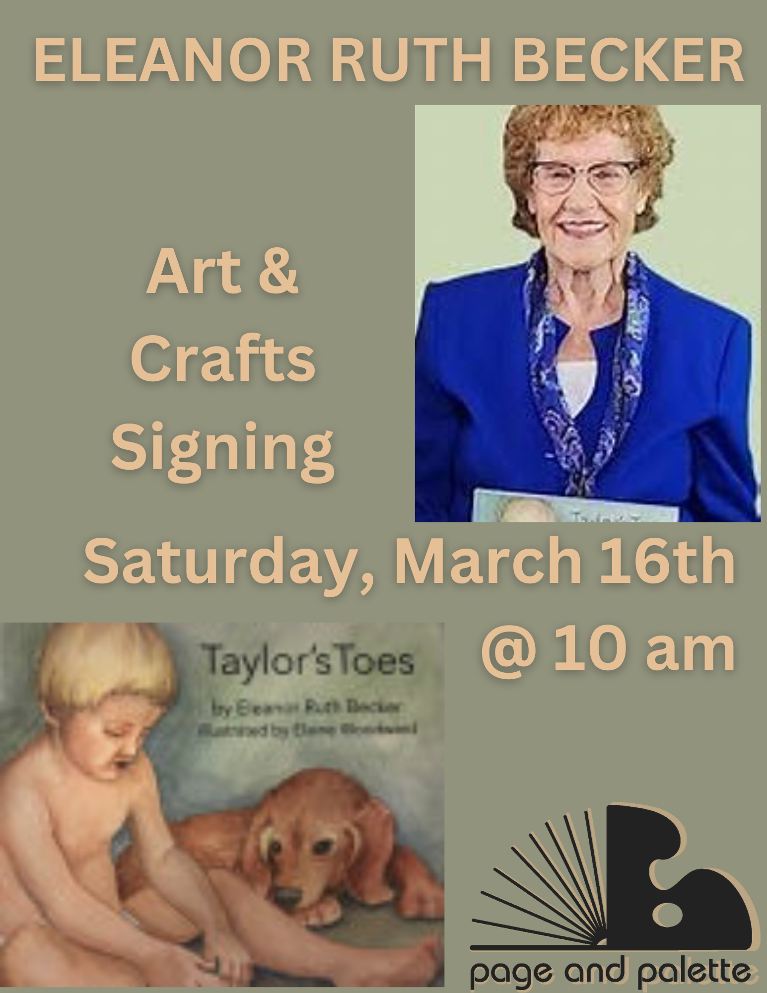 Join us at Page & Palette in the kids’ department for Eleanor Ruth Becker and her book, Taylor’s Toes, The beautiful children's book that follows Taylor as he counts his toes and follows his nose.