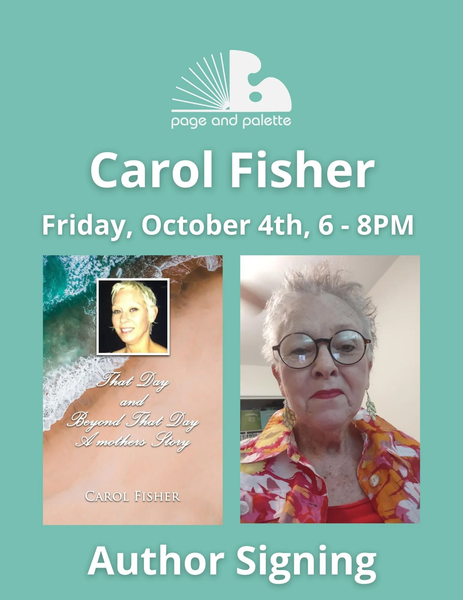 Stop by Page & Palette on First Friday, October 4th from 6-8 PM for an author signing with Carol Fisher!