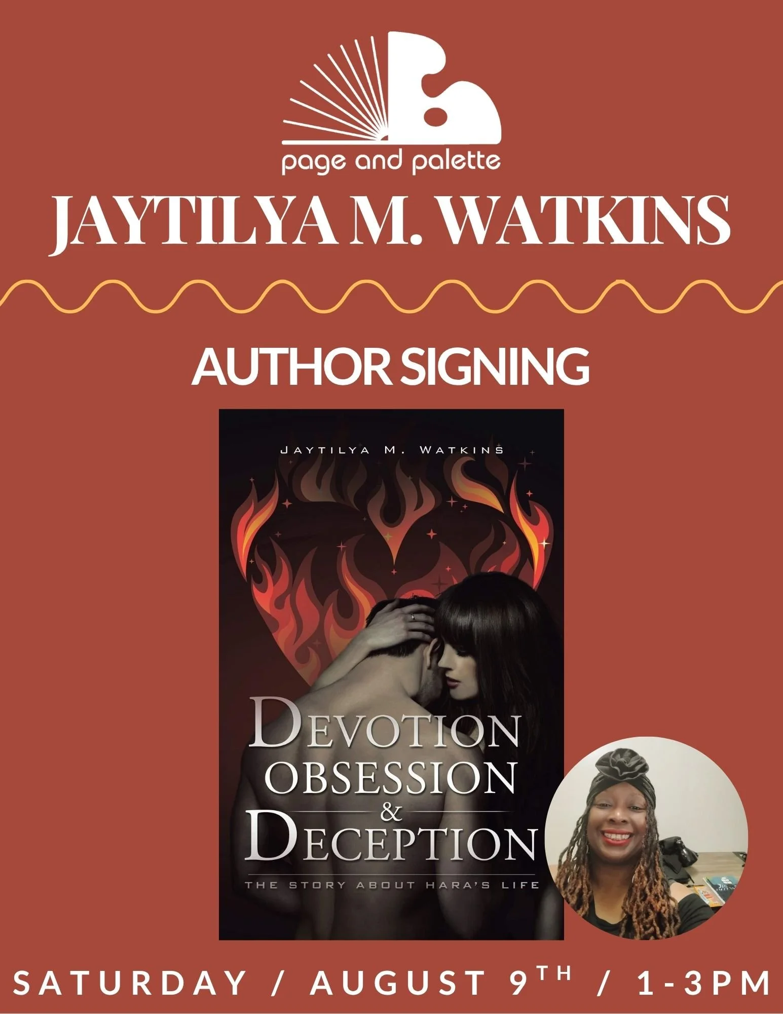 Join us at Page & Palette for Signing Saturday! On August 9th at 1PM, Jaytilya M. Watkins will be here with her book, Devotion, Obsession, & Deception. Enjoy a cup of coffee or a glass of wine as you visit Jaytilya's table. We hope to see you there!