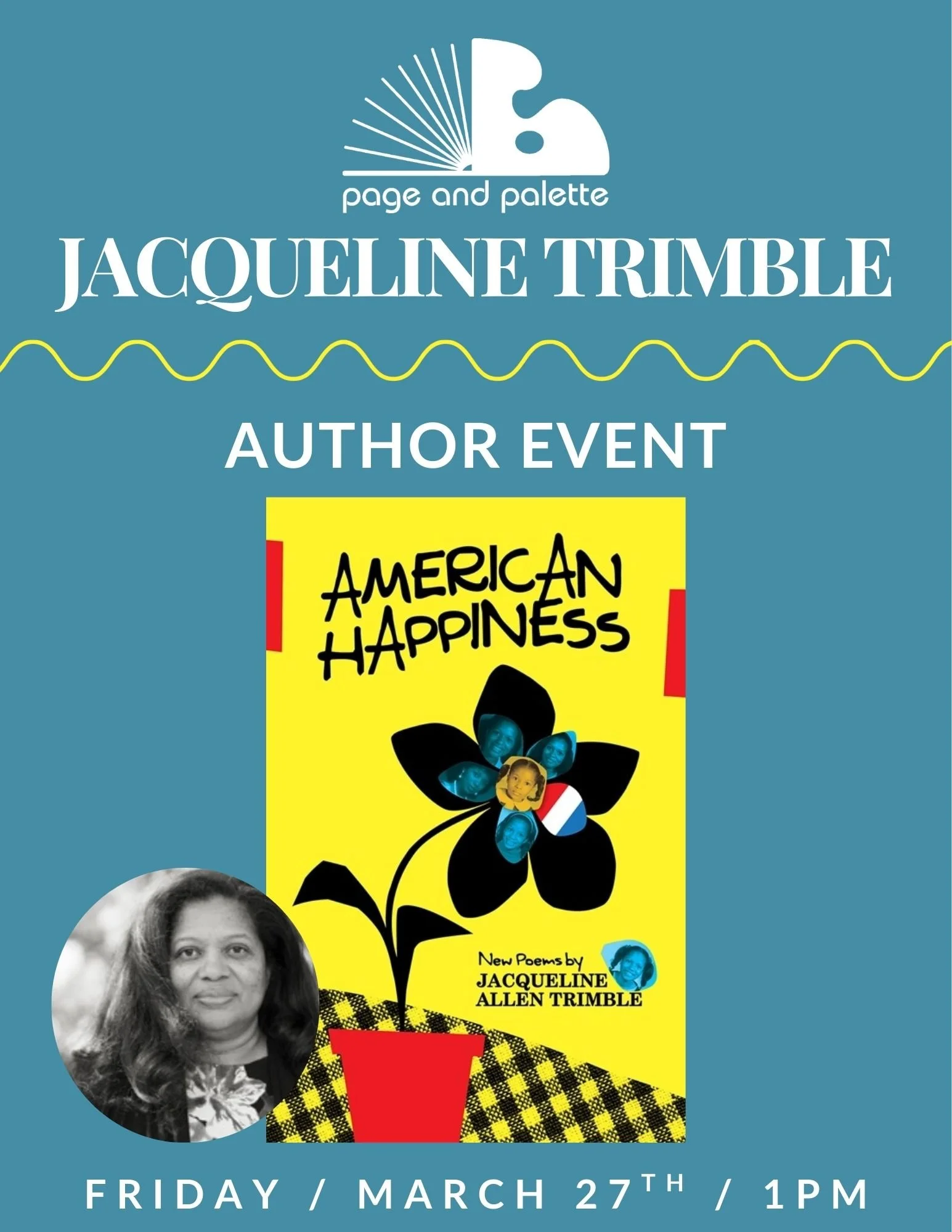 Join us on Friday, March 27th at 1PM to listen to Jacqueline Trimble talk about her book, American Happiness. Enjoy a glass of wine or a specialty cocktail as you listen to Jacqueline’s talk. We hope to see you there!