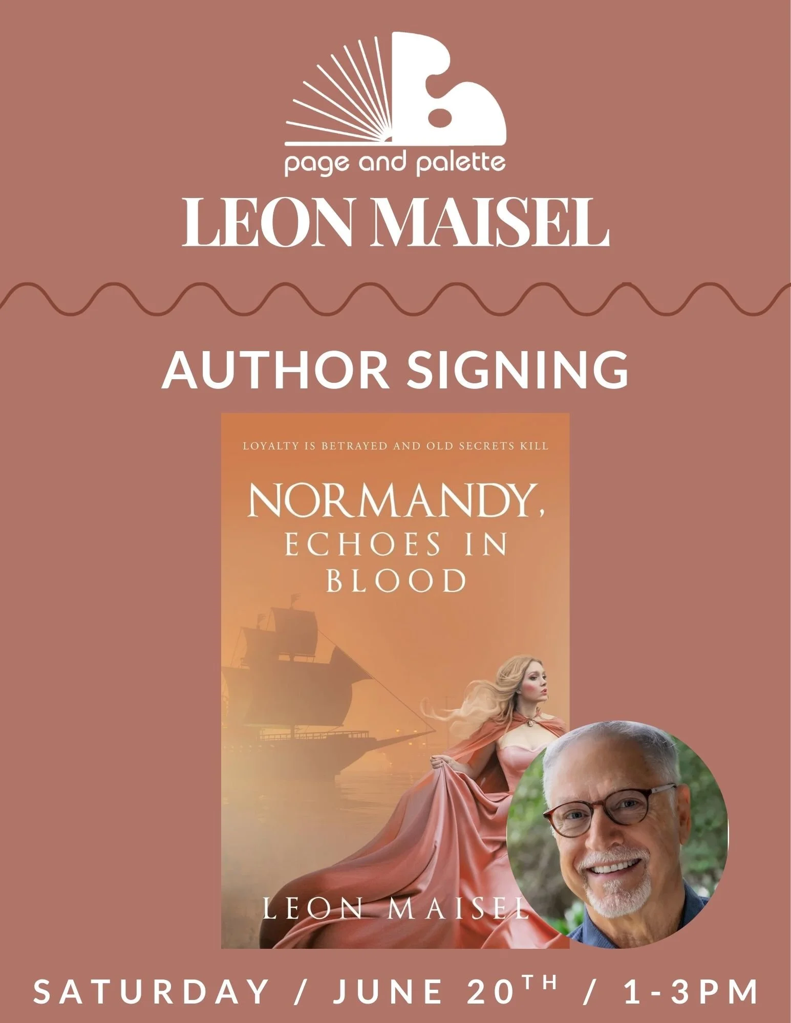 Stop by between 1-3PM to grab a coffee or a glass of wine and get a copy of Normandy, Echoes in Blood signed. Come chat with the author and discover your next great read!